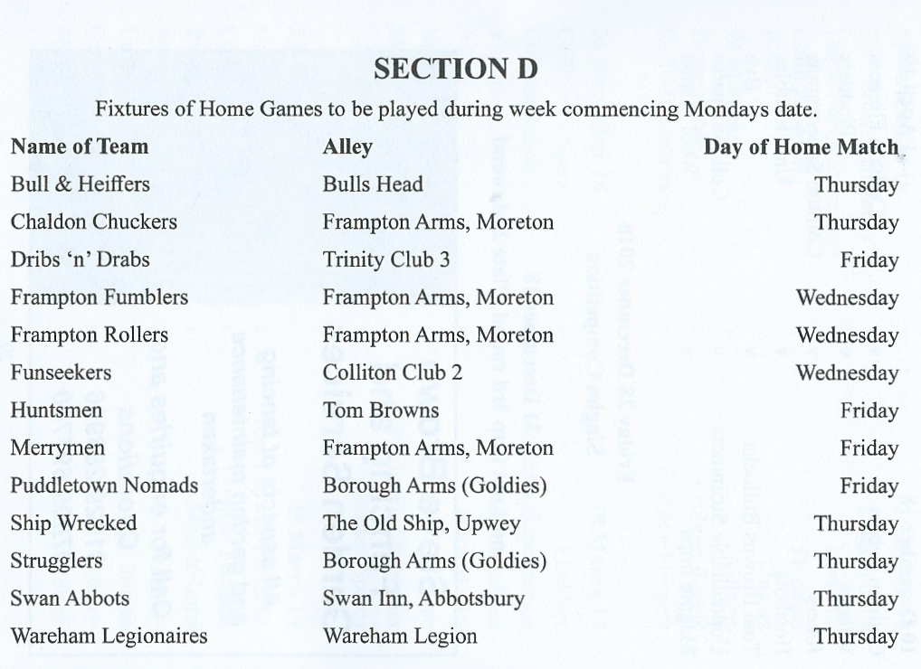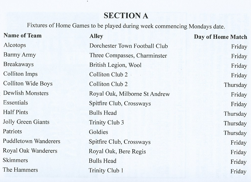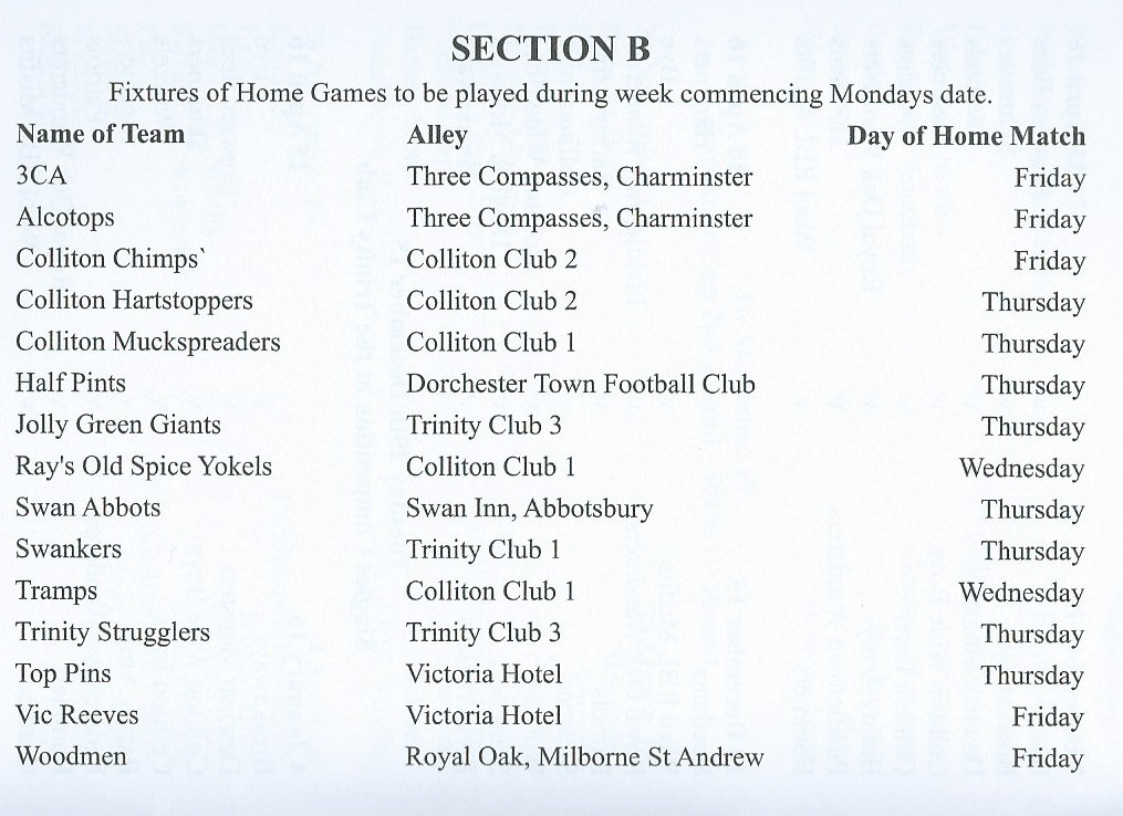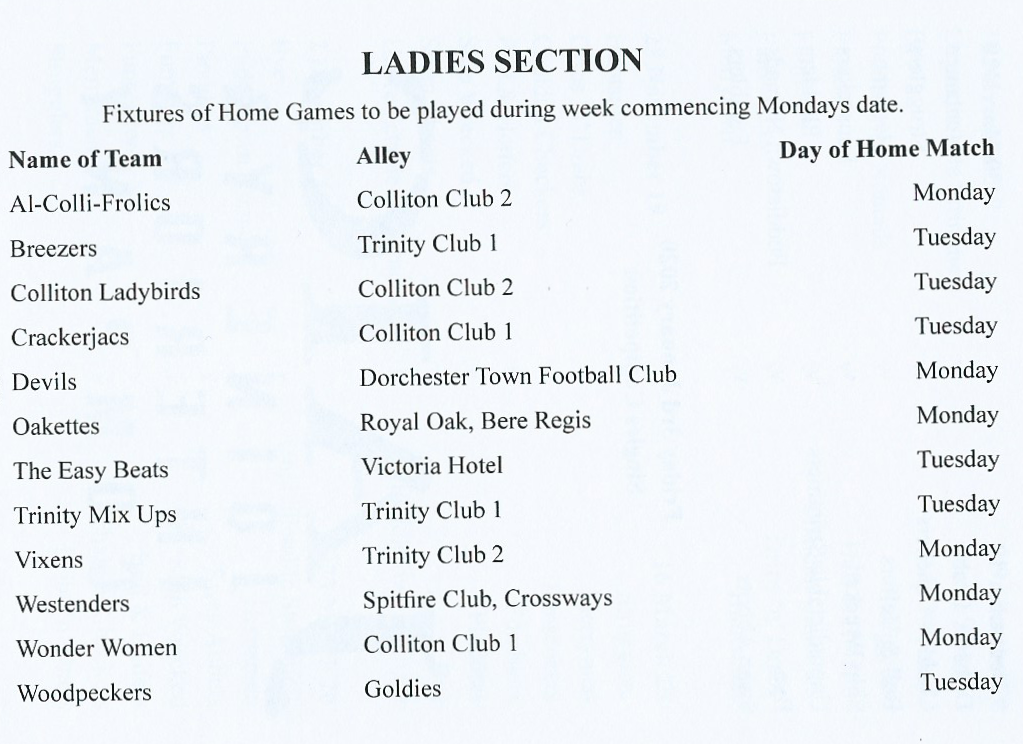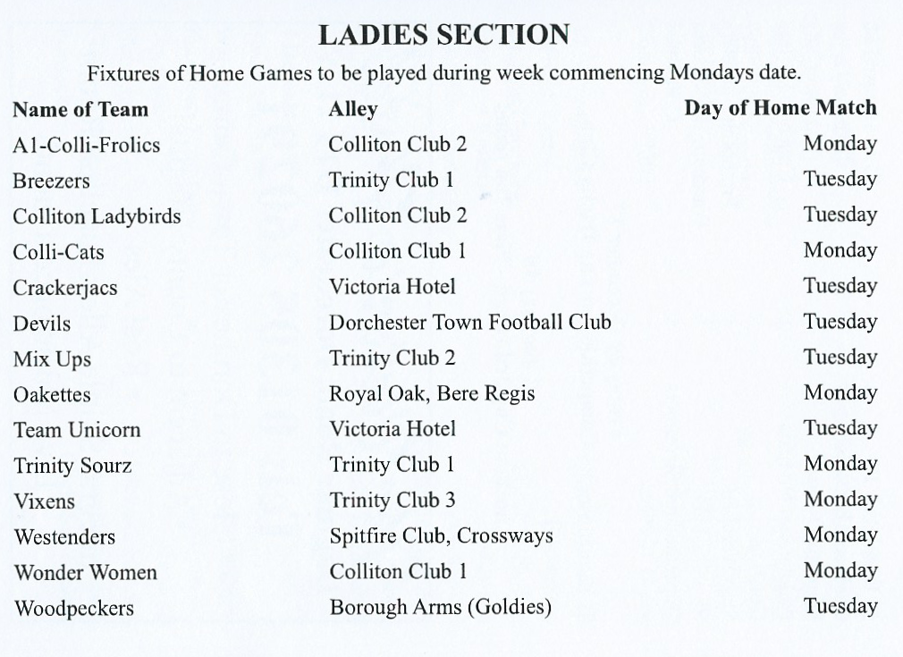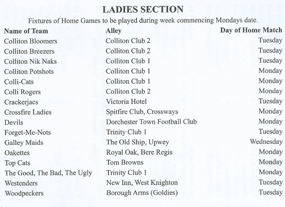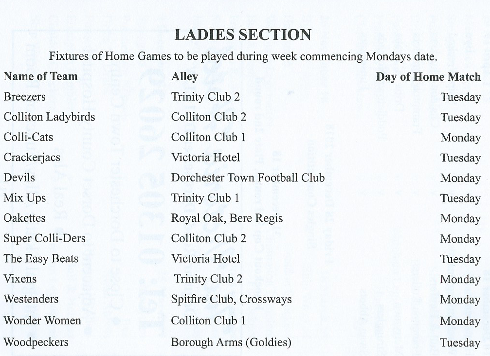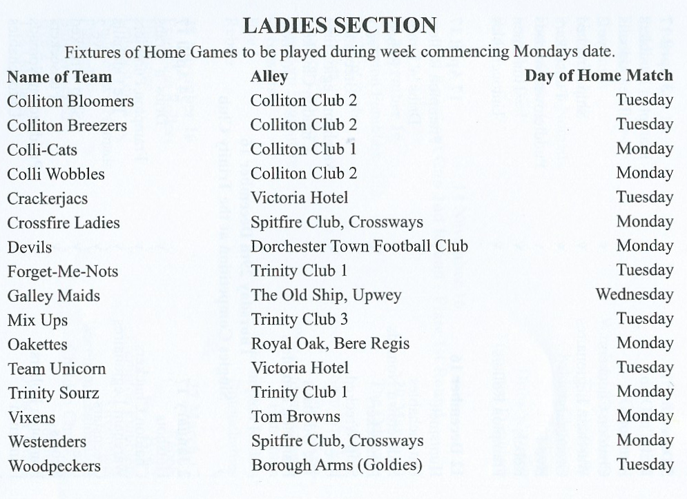 15-16 TO 19-20 15-16 16 – 17 17 – 18 3CA withdrew before the start of the season and were replaced by Imps B who played their home matches at DTFC on a Thursday. 18 – 19 19-20 / Season was null and voided A new ladies team was added before the start of the season, Hot Cheese Stampers, Three Compasses Charminster, on a Tuesday.