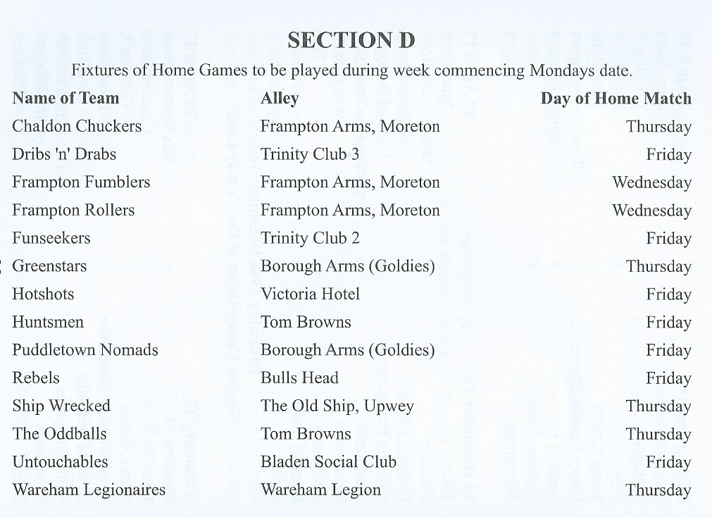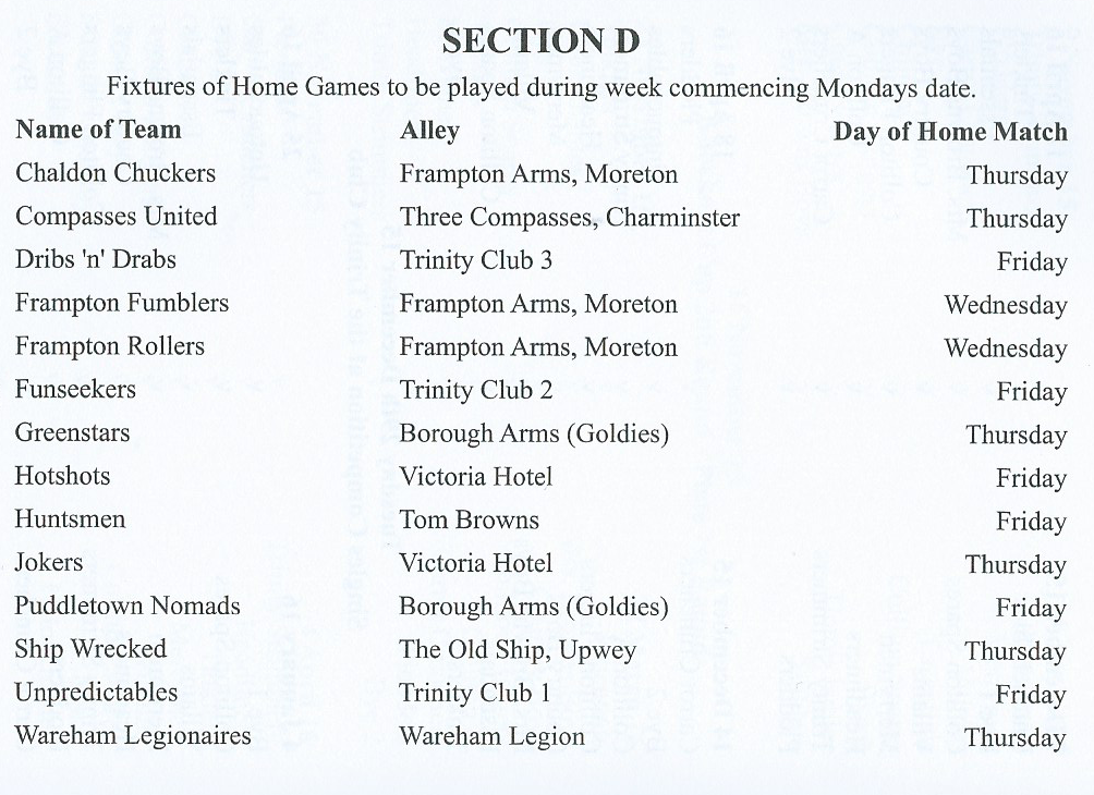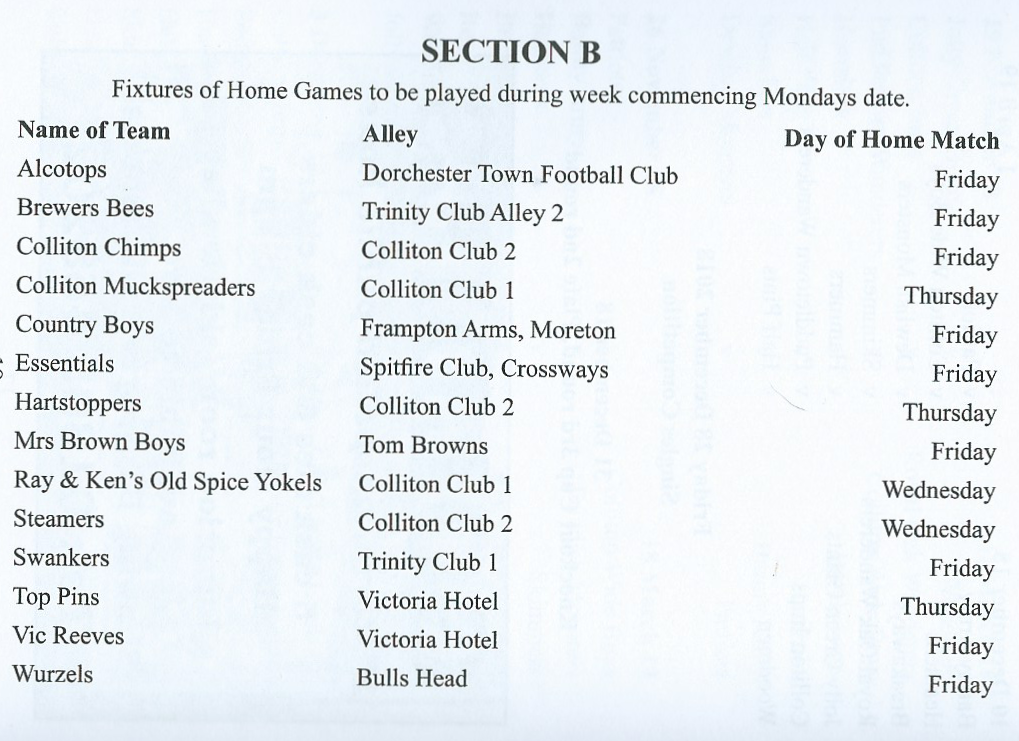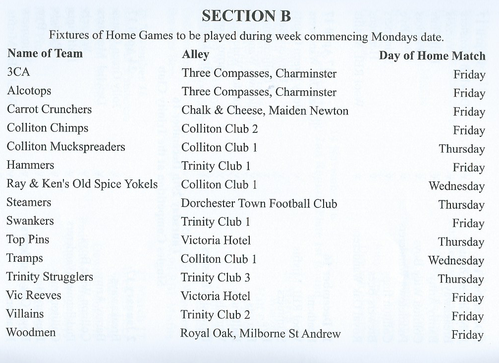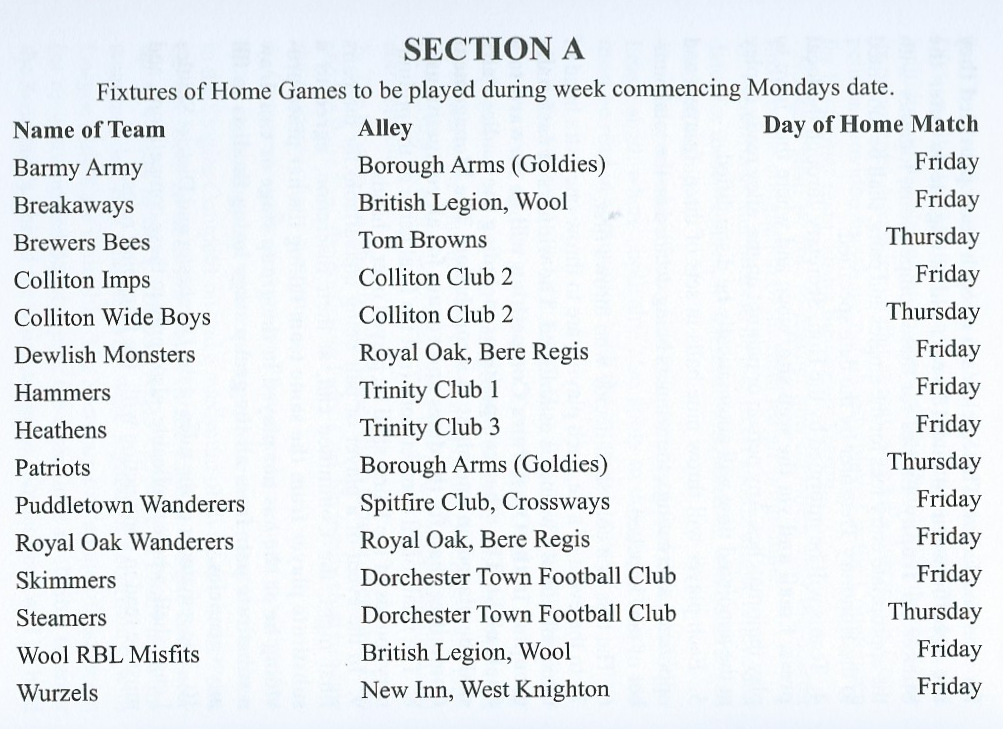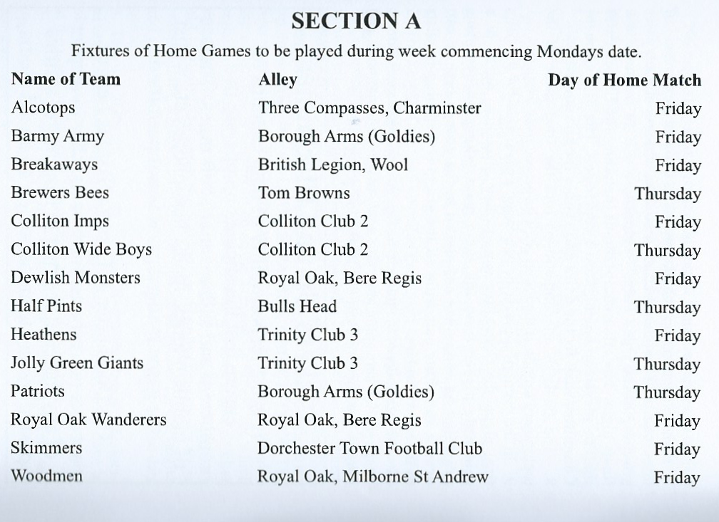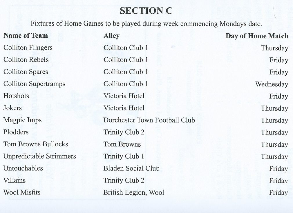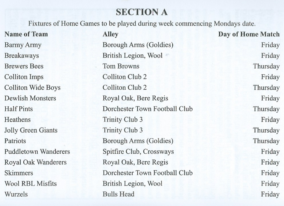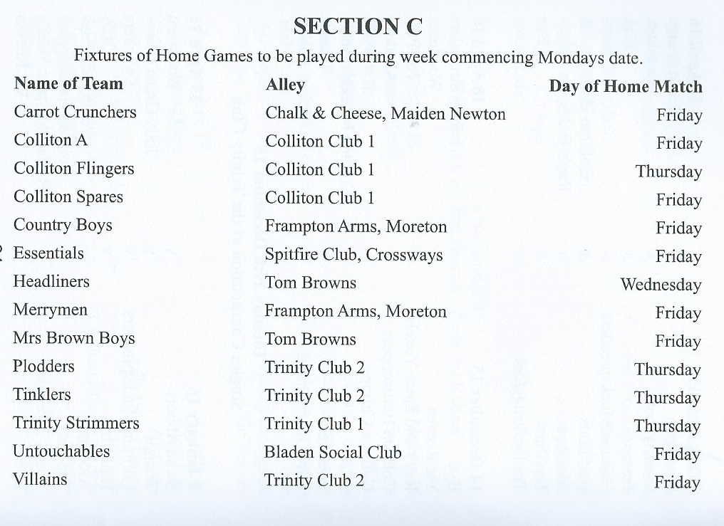 15-16 TO 19-20 15-16 16 – 17 17 – 18 3CA withdrew before the start of the season and were replaced by Imps B who played their home matches at DTFC on a Thursday. 18 – 19 19-20 / Season was null and voided A new ladies team was added before the start of the season, Hot Cheese Stampers, Three Compasses Charminster, on a Tuesday.