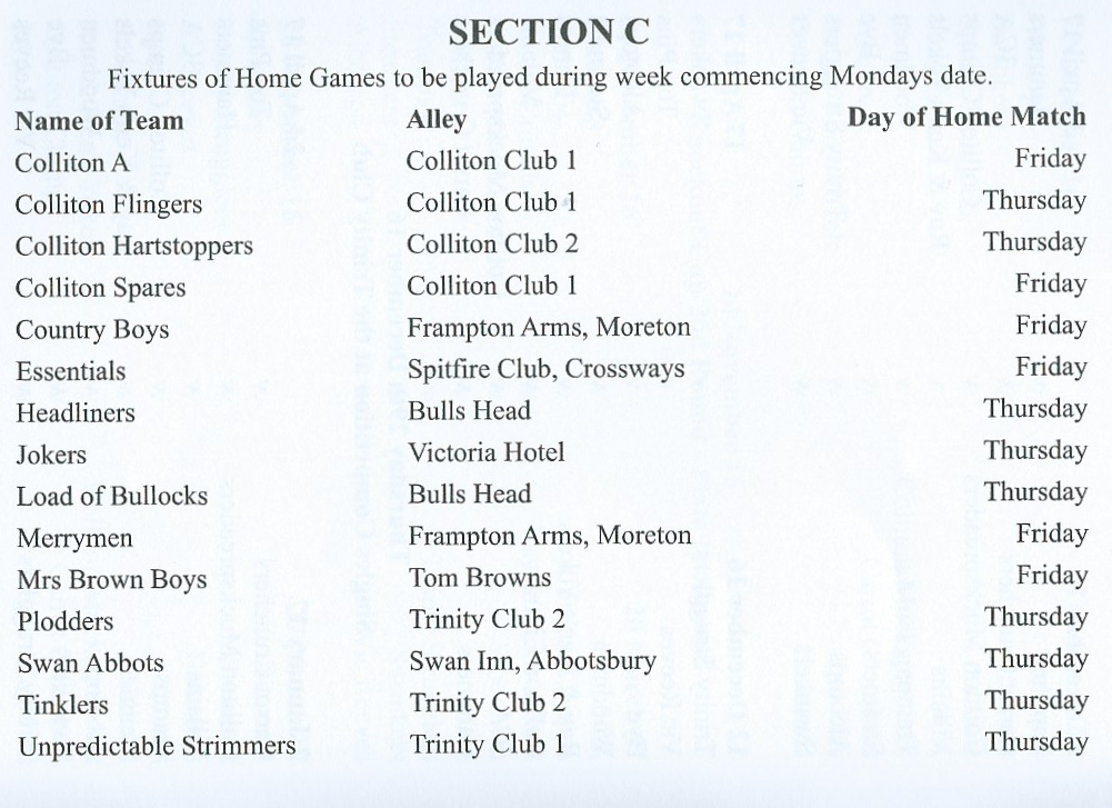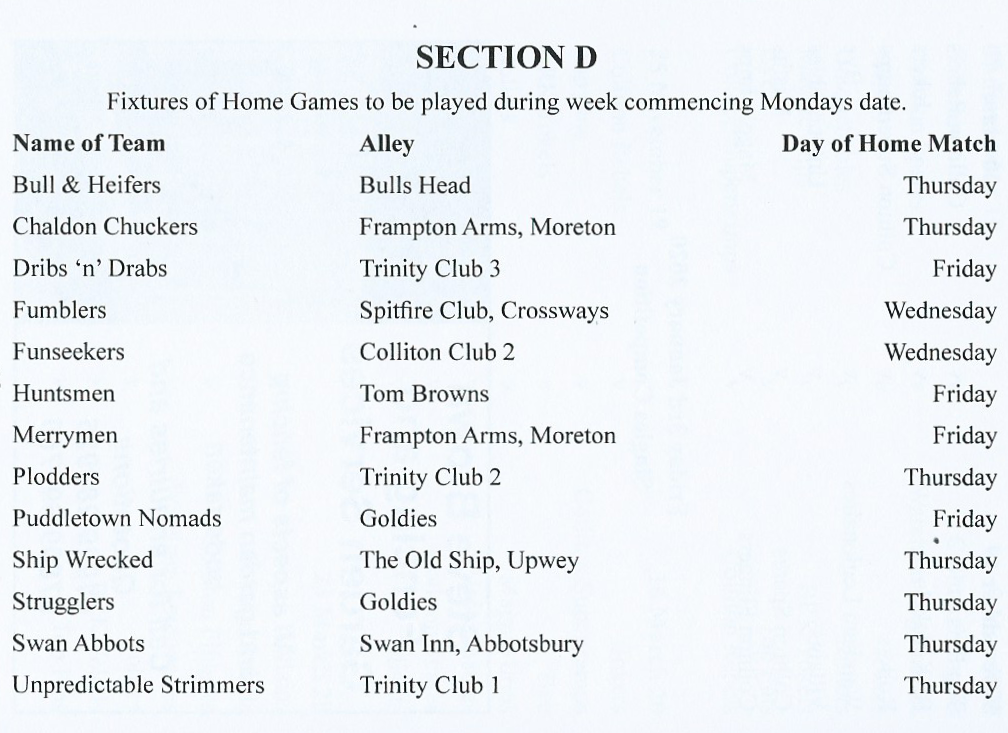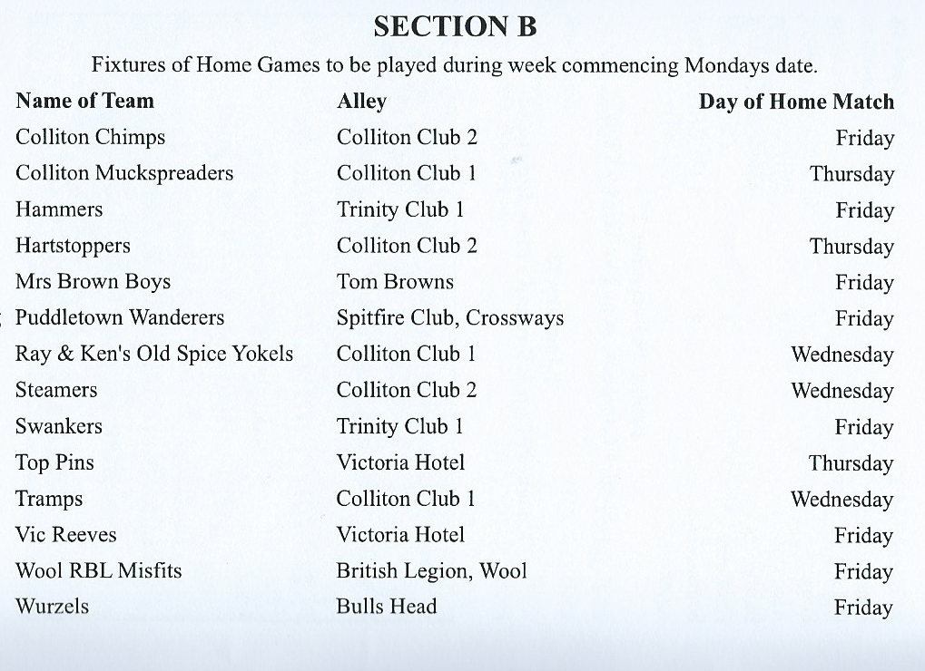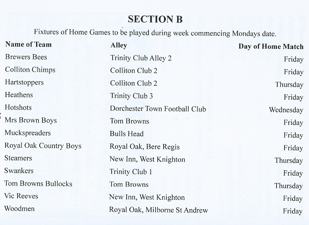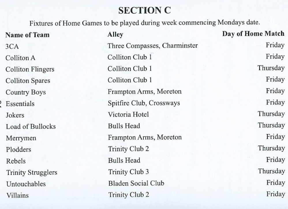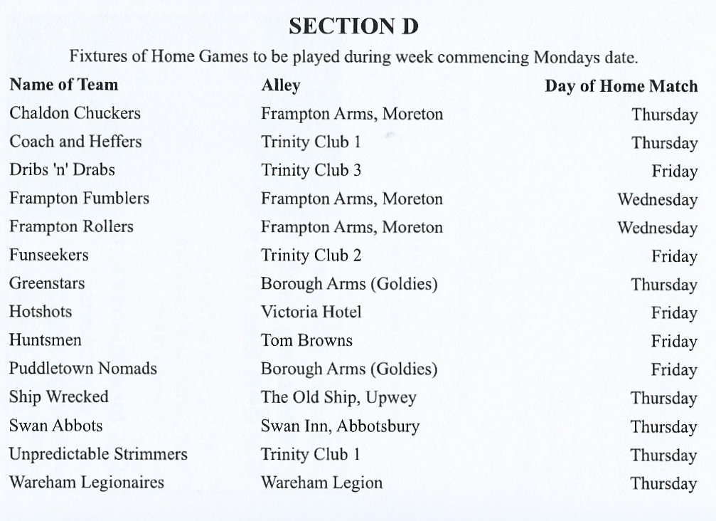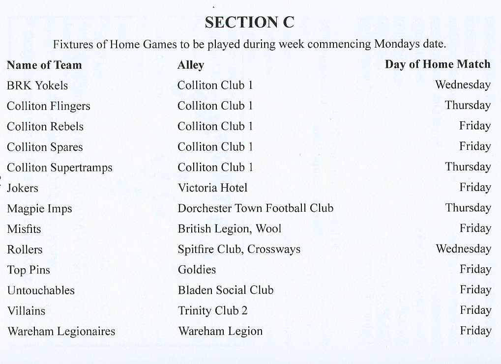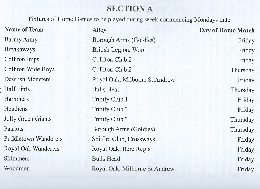 15-16 TO 19-20 15-16 16 – 17 17 – 18 3CA withdrew before the start of the season and were replaced by Imps B who played their home matches at DTFC on a Thursday. 18 – 19 19-20 / Season was null and voided A new ladies team was added before the start of the season, Hot Cheese Stampers, Three Compasses Charminster, on a Tuesday.